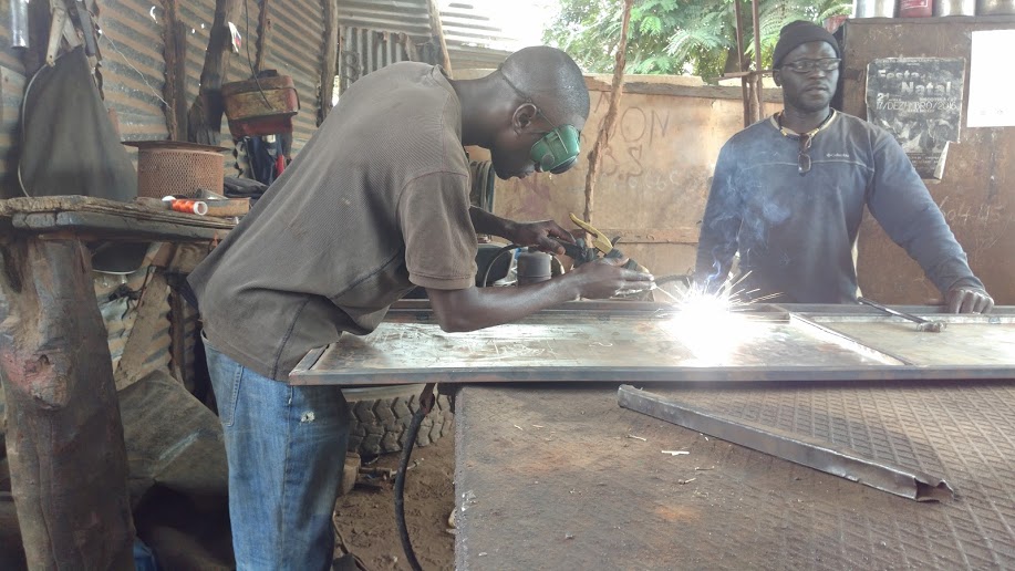 Ciro (right) and Nilton (left) work on welding together a door for a client. Both West Africans studied at the WAVS Vocational School to expand their skill sets so they could take on more types of welding jobs.