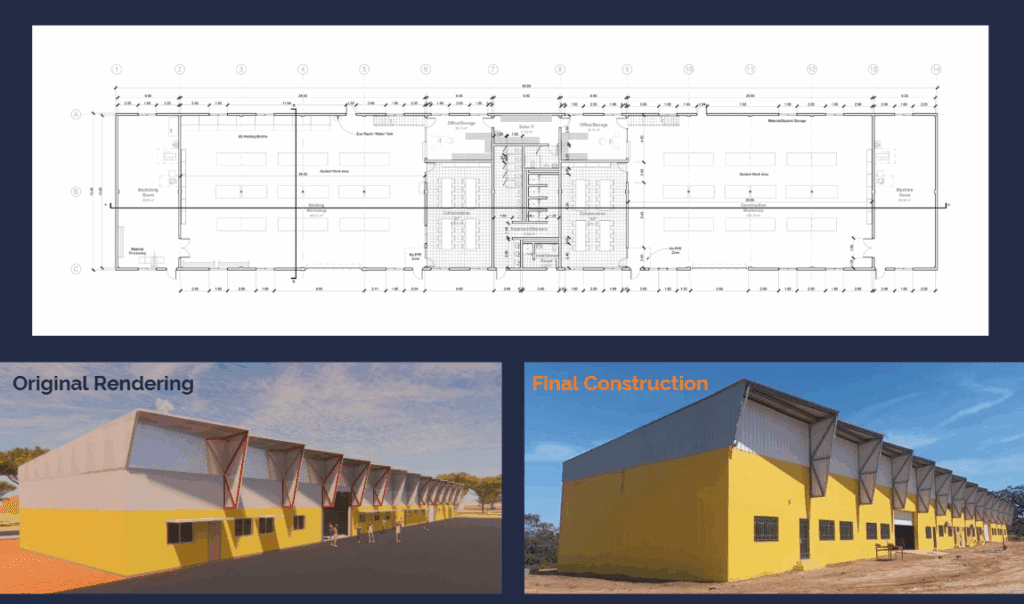 The new building also features classrooms, teachers’ offices, men’s and women’s bathrooms, and four large workshops – all outfitted with the machines, equipment, and tools to train up to 200 students each year.