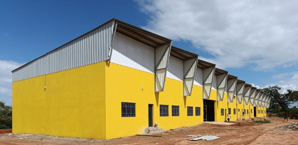 The steel roof system was prefabricated in Portugal and imported to Guinea-Bissau.