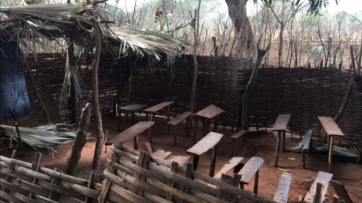 “Schools” in villages in Guinea-Bissau are little more than several wooden benches surrounded by a thatch wall.
