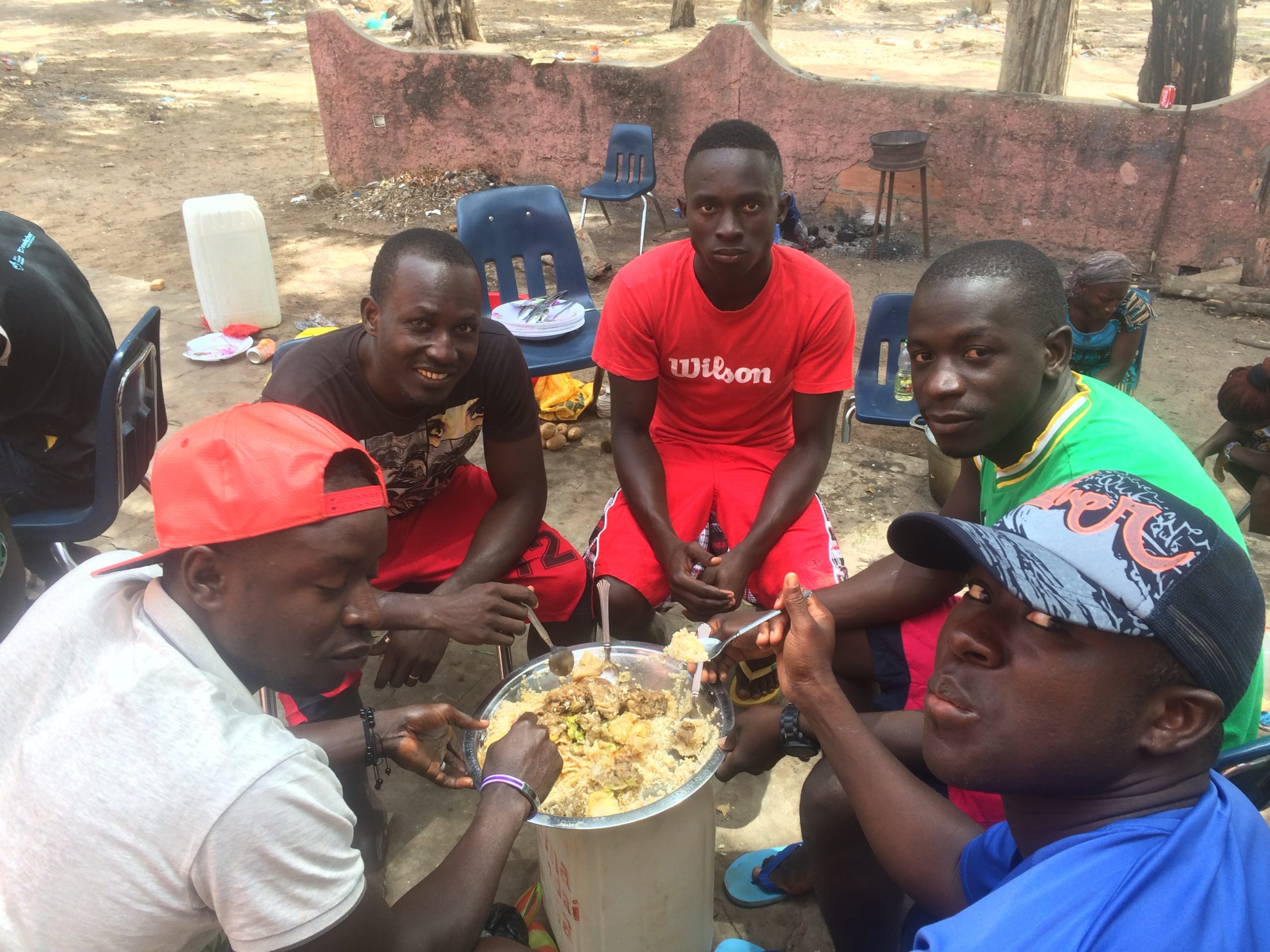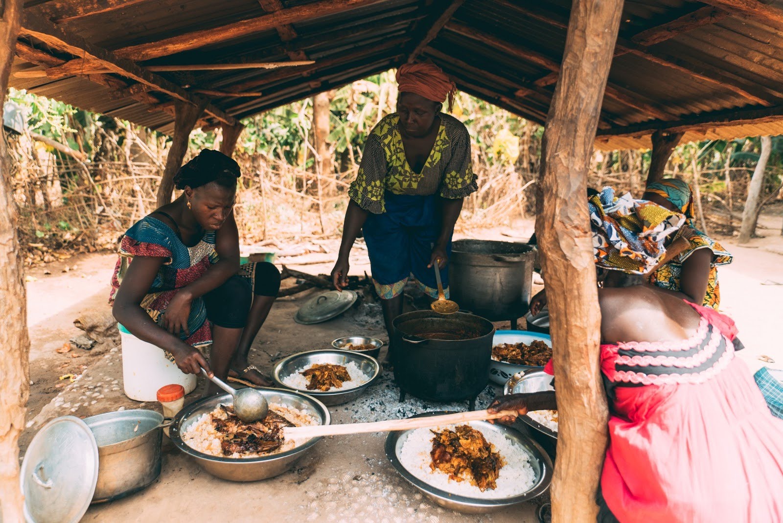 Families in Guinea-Bissau typically have large pots of rice with cooked vegetables and a small piece of chicken or fish for meals. Children are often responsible for helping cook and prepare the food. Once it is ready, everyone eats out of one giant bowl!